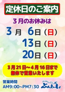 3月の定休日は6日(日)・13日(日)・20日(日)です。