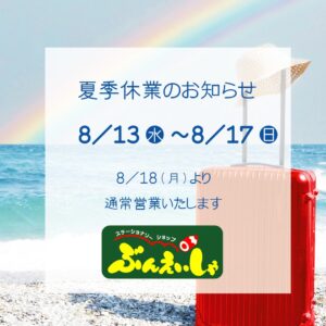 8月13日(水)~17日(日)まで夏期休業させていただきます。