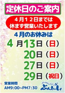 4月のお休みは13日(日)・20日(日)・27日(日)・29日(祝)です。
