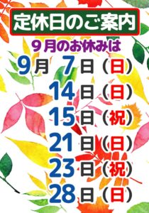 9月の定休日は7日(日)・14日(日)・15日(祝)・21日(日)・23日(祝)・28日(日)です。