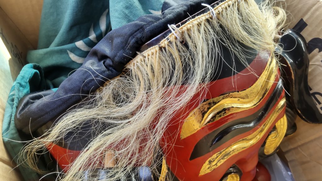 獅子頭の毛の交換、幕の交換、鈴の交換をした画像[/caption]
