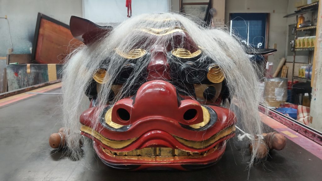 愛知県春日井市の町内会から、獅子頭の修理のお問合せ後、来店いただき、総修理と部分修理の説明をさせていただき、予算内で可能な、部分修理を承りました。