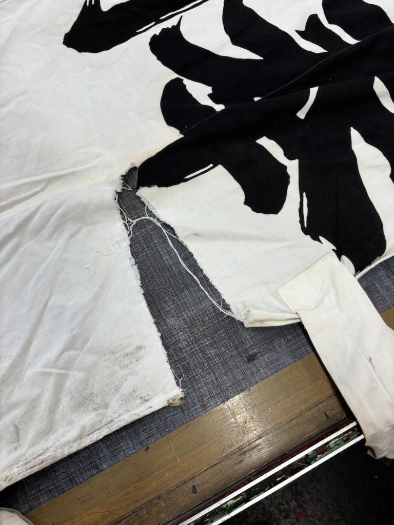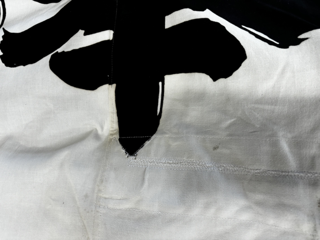 大のぼり(大幟)の修理は目立つ破れに関してはお客様が把握してらっしゃいますが、小さな破れ、穴、チチ布のほつれ、破れなどは気づかないことが多いので、当社でも再度チェックするようにしています。