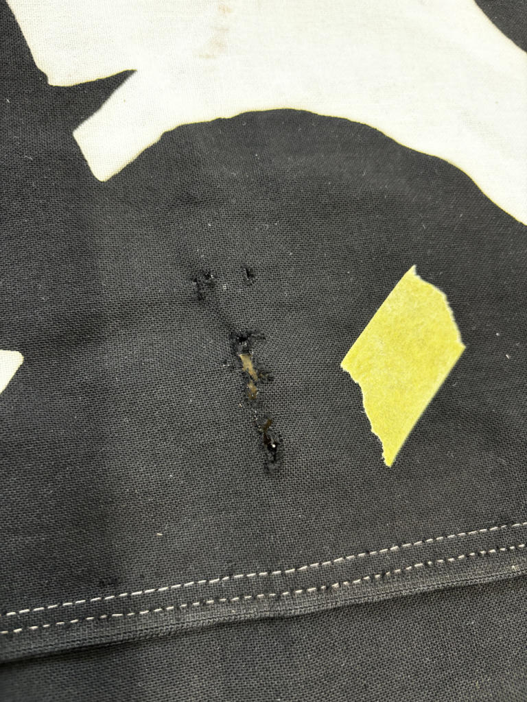 今回は、11号帆布木綿生地を使用し、破れの修理と修理箇所の染め、チチ交換とチチの解れ修理、穴の修理を行いました。