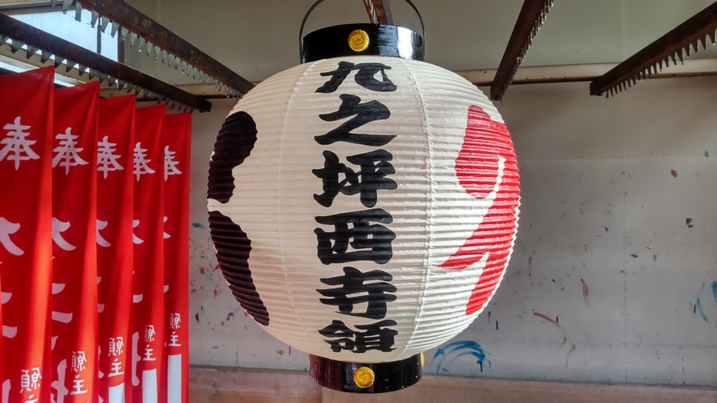 尺五丸(約42×50cm)和紙提灯に、宿の文字を黒と赤で紋入れ、九之坪西寺領と黒文字で名入れしました。