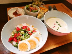 みょうが、生姜、青じそ等薬味や野菜を和えたソースと疲労回復効果の高いチキンで、酷暑を乗り切りましょう。